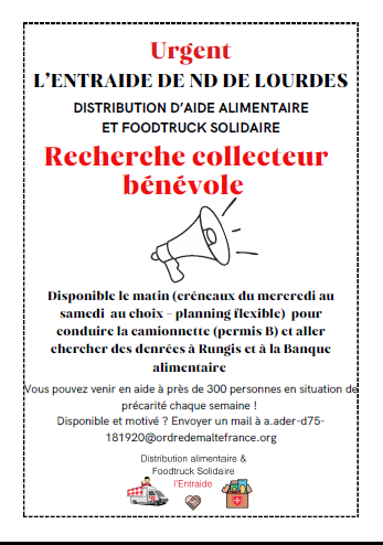 Pour proposer votre aide contactez le Père Xavier Snoëk ou envoyez vos coordonnées par mail à l’adresse : ndlourdes75020@gmail.com.